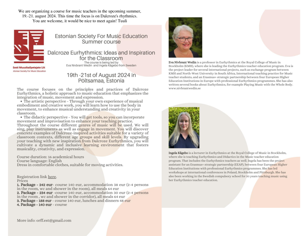 Mūsu igauņu kolēģi šovasar rīko starptautisku kursu mūzikas skolotājiem ar lektorēm no Zviedrijas. Aicina piedalīties arī Latvijas skolotājus. Lauku pilsētiņā Poltsamā( uz ceļa starp Tartu un Tallinu). Pieteikšanās tieši pie rīkotājiem. Varu palīdzēt ar neskaidriem jautājumiem, tel. 26516010. Ar Igauņu aktīvākajiem skolotājiem- lektoriem Orff studijai cieša sadarbība jau 15 + gadus. Esam aicinājuši pie sevis, esam bijuši ciemos Potsamā, Tallinā, Mooste.